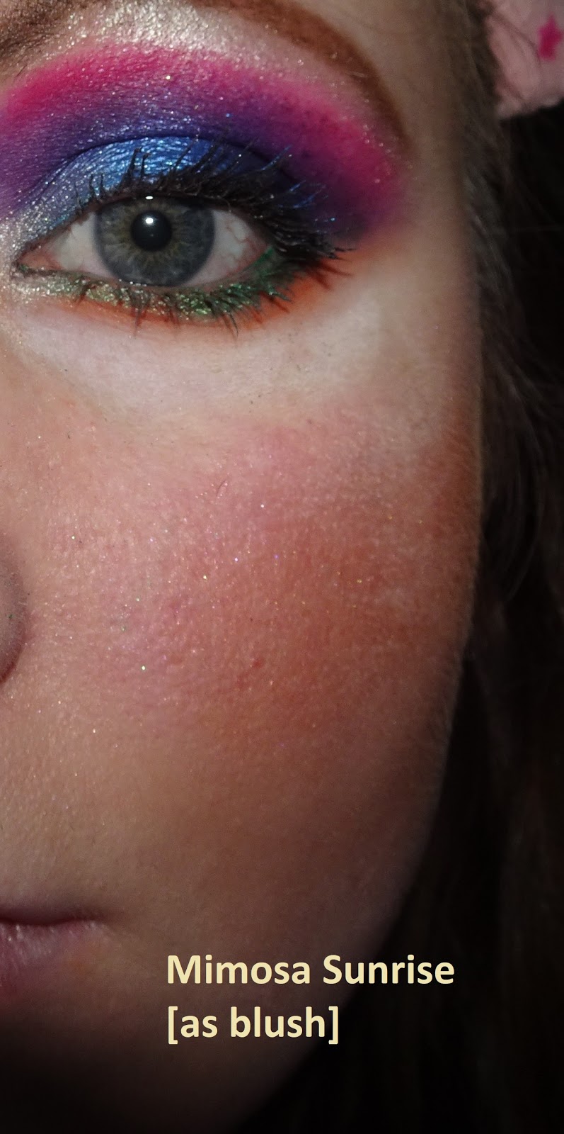 Mimosa Sunrise: the foil base is thicker compared to the other compact that I reviewed, so the shade is very pigmented and not very glowy. It might make a decent blush for those with medium or deep skintones, but on my skintone I don't like it as one; I think that it just looks like a fading bruise.